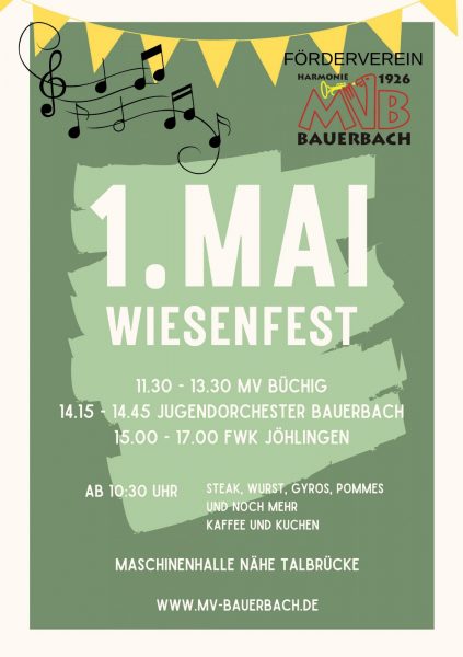 Auch in diesem Jahr lädt der Förderverein des Musikvereins Harmonie Bauerbach herzlich zum traditionellen Wiesenfest am 1. Mai ein. Rund um die idyllisch gelegene Maschinenhalle der Bauerbacher Landwirte – an der Straße zwischen Bauerbach und Gochsheim, nahe der Talbrücke – erwartet Wanderer und Radfahrer eine gemütliche Raststation mit guter Blasmusik. Neben frisch gezapftem Fassbier gibt es leckere Speisen wie Steak, Gyros und Pommes sowie ein vielfältiges Kuchenangebot mit Kaffee. Für die musikalische Unterhaltung sorgen um 11.30 Uhr unsere Musikfreunde aus Büchig. Das Bauerbacher Jugendorchester zeigt im Anschluss gegen 14.15 Uhr sein Können. Danach hält die Feuerwehrkapelle aus Jöhlingen ab etwa 15 Uhr die Stimmung hoch. Genießen Sie den Maifeiertag in gemütlicher Atmosphäre bei unterhaltsamer Blasmusik und der herzlichen Gastfreundschaft des Musikvereins Harmonie Bauerbach. Wir freuen uns auf Ihren Besuch!