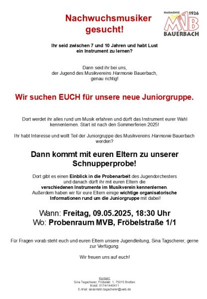 Musikverein Bauerbach gründet neue Juniorgruppe Der Musikverein Harmonie Bauerbach ist auf der Suche nach neuen Nachwuchsmusikern:Für eine neue Juniorgruppe sucht der Verein musikbegeisterte Kinder, die gerne ein Instrument (Blasinstrument oder Schlagzeug) lernen möchten. Die Nachwuchsmusiker erwartet eine spannende und aufregende Zeit in der Juniorgruppe, voller neuer Erfahrungen, abwechslungsreicher Gruppenstunden, Ausflügen, Events und natürlich eine optimale Vorbereitung für die Zeit im Jugendorchester! In der Juniorgruppe werden die Kinder zunächst sämtliche musiktheoretische Kenntnisse lernen. Der Theorieunterricht findet wöchentlich für rund eine Stunde im Probenraum des Musikvereins (Fröbelstraße 1/1 in Bauerbach) statt. Währenddessen beginnen die Kinder mit dem Erlernen ihres Wunschinstruments bei Musiklehrern von Musikschulen. Im Laufe der Juniorgruppe werden die Nachwuchsmusiker langsam auch an das Zusammenspiel in der Gruppe herangeführt und dürfen ihr Instrument in ersten Musikstücken in der Gruppe ausprobieren. Start der Juniorgruppe wird nach den Sommerferien sein. Der Musikverein lädt alle interessierten Kinder mit ihren Eltern zu einer Schnupperprobe am 09. Mai 2025 um 18:30 Uhr im Proberaum des Musikvereins (Fröbelstraße 1/1 in Bauerbach) ein, bei der zunächst ein Einblick in die Probenarbeit des Jugendorchesters gegeben wird und anschließend die verschiedenen Instrumente kennengelernt werden können. Auch das Jugendleiterteam wird für Fragen und Informationen vor Ort sein. Um eine Anmeldung per E-Mail an jugendleitung@mv-bauerbach.de wird gebeten. Für Rückfragen steht die Jugendleiterin Sina Tagscherer unter der genannten E-Mail zur Verfügung.