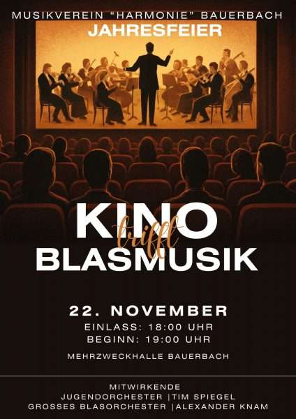 Der Musikverein Harmonie Bauerbach lädt herzlich zu einem ganz besonderen Abend ein:Taucht mit uns ein in die faszinierende Welt der Filmmusik! Am 22.11.2025 öffnet die Bauerbacher Halle um 18:00 Uhr ihre Türen. In bewährter Weise führt euch Wolfgang Pfahler durch den Abend.Den musikalischen Auftakt gestaltet unser Jugendorchester um 19:00 Uhr. Anschließend entführt euch das große Blasorchester noch tiefer in die Klangwelten bekannter Filmklassiker. Freut euch auf musikalische Highlights aus: Frozen, The Greatest Showman, Miss Marple, James Bond und viele weitere unvergessliche Filmmomente! Natürlich ist auch für das leibliche Wohl bestens gesorgt – von Grillschinken über Wurstsalat und Gemüsemaultaschen bis hin zu belegten Laugenstangen (Wurst/Käse) ist für jeden Geschmack etwas dabei. Kommt vorbei und genießt einen Abend voller Musik, Emotionen und guter Stimmung – wir freuen uns auf euch!