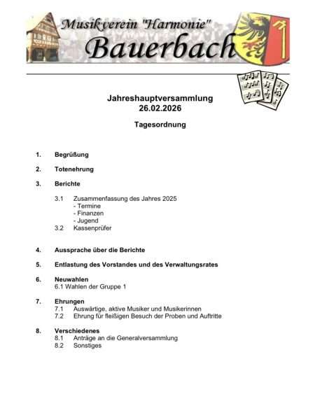 Am Donnerstag, den 26.02.2026 findet um 20 Uhr die Mitgliederversammlung des Musikvereins Harmonie Bauerbach e.V. statt. Der Versammlungsort ist die Mehrzweckhalle Bauerbach.