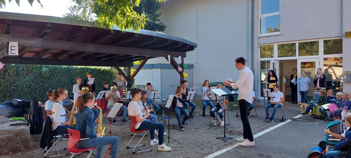 Nach langer Zeit durften nun auch die Nachwuchsmusikerinnen und Nachwuchsmusiker unseres Jugendorchesters endlich wieder vor Publikum musizieren. Unter der Leitung ihres neuen Dirigenten, Simon Sandrock, begleiteten sie am Samstag, 18.09.2021, die Einschulungsfeier der Grundschule Bauerbach. Mit Songs wie Rolling in theDeep, Havana und Feel it still begeisterten sie Schüler, Eltern und Lehrer. Spätestens bei ihrer Zugabe Shake it off blieb kein Bein mehr ruhig. Es wurde mitgeklatscht und mitgewippt. Die 18 Jungmusiker freuten sich und hatten sichtlich Spaß, endlich wieder vor Publikum auftreten zu dürfen! Und auch der neue Jugenddirigent Simon Sandrock war stolz auf seine Musikerinnen und Musiker und freut sich auf kommende Auftritte.