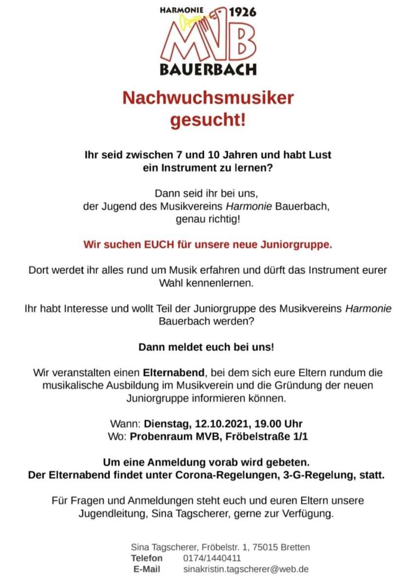 10 Nachwuchsmusiker des Musikvereins „Harmonie“ Bauerbach absolvieren das Jungmusikerleistungsabzeichen Im August 2021 nahmen insgesamt 10 Nachwuchsmusiker des Musikvereins Bauerbach am Sommerlehrgang des Blasmusikverbandes Karlsruhe teil und absolvierten dort die Jungmusikerleistungsabzeichen in Bronze und Silber. 8 Wochen Vorbereitungszeit liegen hinter den zehn Musikern, als sie Anfang August in die Lehrgangswoche im Schloss Flehingen starten. Der Instrumentalunterricht erfolgt durch die jeweiligen Musiklehrer, der musiktheoretische Unterricht – dazu gehören Musikkunde, Gehörbildung und Rhythmik – erfolgte über das Jugendleiterteam des Vereins. Eine besondere Herausforderung für Jugendleitung Sina Tagschererund ihr Team, denn aufgrund der anhaltenden Corona-Pandemie erfolgt der Unterricht rein digital. Dies erforderte ein äußerst hohes Maß an Disziplin der Absolventen. Denn nach dem digitalen Unterricht hieß es üben,…