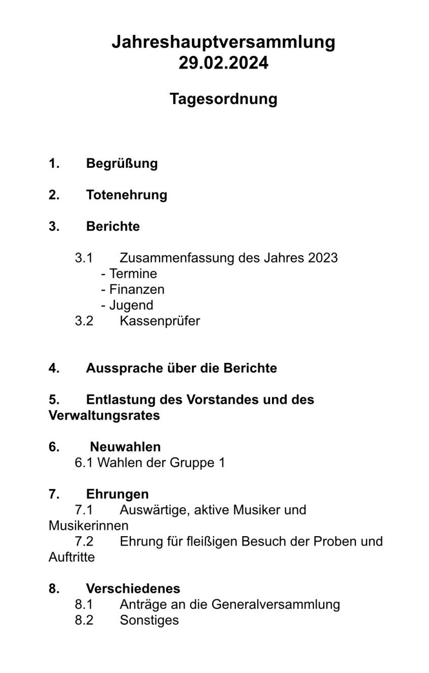 Am Donnerstag, den 29.02.2024 findet um 20 Uhr die Mitgliederversammlung des Musikvereins Harmonie Bauerbach e.V. statt. Der Versammlungsort ist die Mehrzweckhalle Bauerbach. Auf der Tagesordnung stehen neben den Berichten der Vorstandschaft und Neuwahlen der Gruppe 1 auch die Totenehrung und Ehrungen. Die detaillierte Tagesordnung ist auf der Homepage www.mv-bauerbach.de einzusehen. Diese folgt in Kürze. Zur Mitgliederversammlung sind alle Mitglieder des Vereines herzlich eingeladen. Anträge können bis spätestens eine Woche vorher bei der Vorstandschaft eingereicht werden.