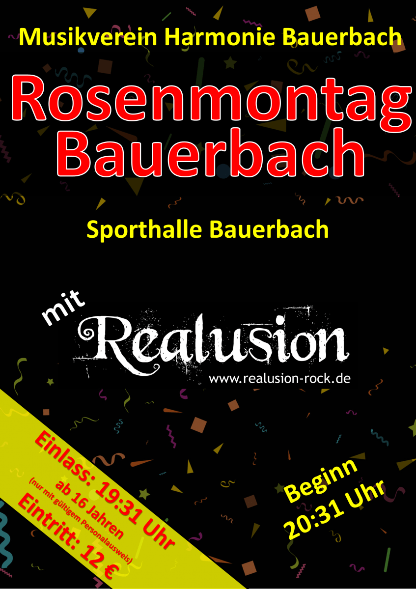 Abends trifft man sich am Rosenmontag wieder zur traditionellen Rosenmontagsparty des Musikvereins in der Mehrzweckhalle Bauerbach. Um 20.31 Uhr beginnt die Veranstaltung mit Live-Musik. Einlass ist bereits ab 19.31 Uhr. Da es keinen Kartenvorverkauf gibt, lohnt es sich, pünktlich zu kommen. In diesem Jahr steht zum ersten Mal die Band Realusion auf der Bühne. Spaß ist vorprogrammiert, wenn das Lead-Sängerduo die Bühne mit der ganzen Bandbreite des Rock und Pop unsicher macht, um gut gelaunt und mühelos durch die unterschiedlichsten Zeiten und Genres zu springen. In Sachen Abwechslungsreichtum macht den sieben erfahrenen Bandmitgliedern wirklich keiner etwas vor. Egal ob vor oder auf der Bühne: Springen, Singen und Tanzen ist angesagt,…