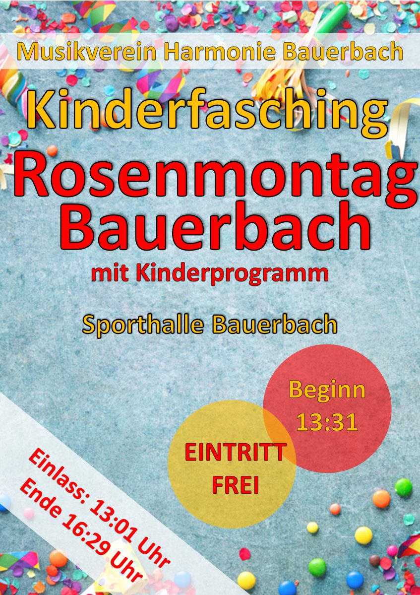 Am Rosenmontag geht es in Bauerbach auch in diesem Jahr wieder bunt zu. Ab 13.01 Uhr treffen sich die kleinen und etwas größeren Narren in der Mehrzweckhalle zum Kinderfasching. Es erwartet Sie eine Party für die ganze Familie, bei der die Kinder natürlich im Mittelpunkt stehen. Das Spieleteam des Musikvereins Harmonie Bauerbach hat ab 13.31 Uhr ein abwechslungsreiches Programm mit tollen Spielen und lustigen Aktionen für Prinzessinnen, Cowboys, Piraten, Clowns und andere Kostümierte zusammengestellt. Somit ist für die Unterhaltung von Jung und Alt bestens gesorgt: Die Kinder sind bei Bewegungsspielen und verschiedenen Tänzen zu aktuellen Hits und traditionellen Faschingsritualen sowie originellen Mitmachspielen beschäftigt. Während sie sich austoben, können sich die…