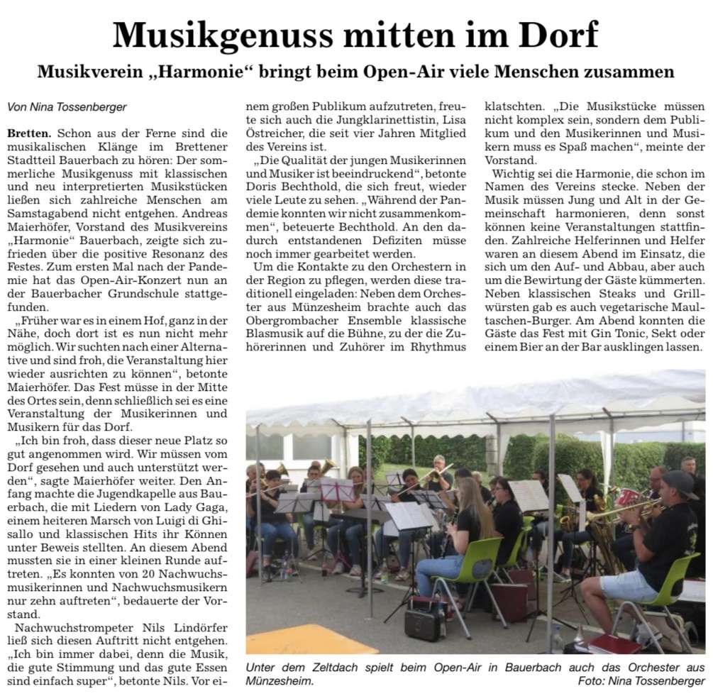 Quelle: BNN vom 19.06.2023 Wir freuen uns über die positive Rückmeldung zu unserem ersten Musik-Treff im Hof der Bauerbacher Grundschule. Bei herrlichem Wetter und wunderbarer Blasmusik konnten wir zusammen mit unseren Gästen einen herrlichen Abend erleben.