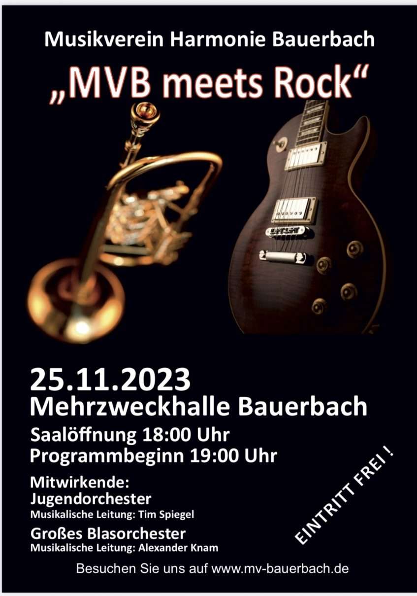 Der Musikverein Harmonie Bauerbach lädt herzlich zu einem ganz besonderen Abend ein:Taucht mit uns ein in die faszinierende Welt der Filmmusik! Am 22.11.2025 öffnet die Bauerbacher Halle um 18:00 Uhr ihre Türen. In bewährter Weise führt euch Wolfgang Pfahler durch den Abend.Den musikalischen Auftakt gestaltet unser Jugendorchester um 19:00 Uhr. Anschließend entführt euch das große Blasorchester noch tiefer in die Klangwelten bekannter Filmklassiker. Freut euch auf musikalische Highlights aus: Frozen, The Greatest Showman, Miss Marple, James Bond und viele weitere unvergessliche Filmmomente! Natürlich ist auch für das leibliche Wohl bestens gesorgt – von Grillschinken über Wurstsalat und Gemüsemaultaschen bis hin zu belegten Laugenstangen (Wurst/Käse) ist für jeden Geschmack etwas dabei.…