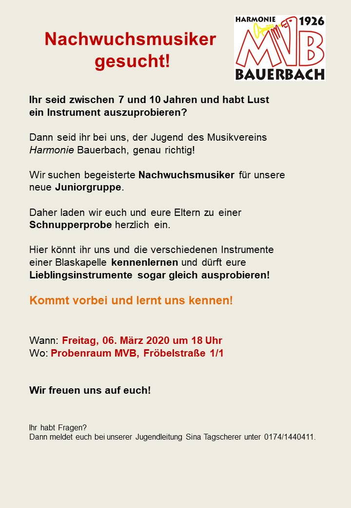 Am Donnerstag, den 01.02.2024 lädt der Musikverein Harmonie Bauerbach herzlich zu seiner offenen Musikprobe um 19.50 Uhr in die Mehrzweckhalle Bauerbach ein. Mit diesem Termin sollen sowohl ehemalige als auch neue Gesichter die unverbindliche Gelegenheit bekommen mal wieder Blasmusikluft zu schnuppern.  Gerne können die geplanten Stücke zuvor unter vorstand@mv-bauerbach.de angefordert werden, um sich schon einmal mit den Noten vertraut zu machen.  Der MVB freut sich über jeden Besucher. Weitere Informationen sind auf der Homepage www.mv-Bauerbach.de zu finden.